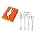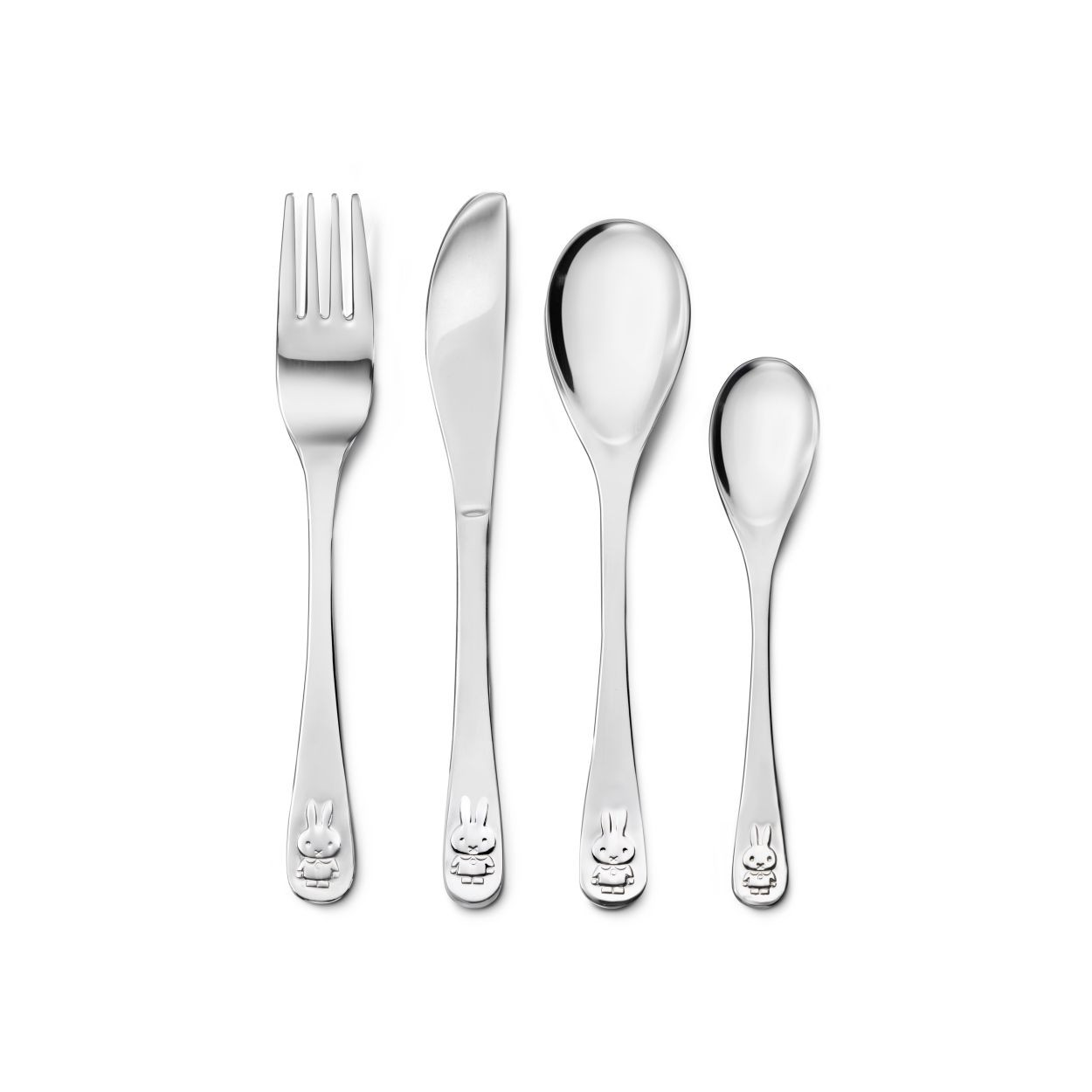 Populaire 4-delige bestekset van het wereldberoemde konijntje nijntje, getekend door Dick Bruna. Op ieder bestekonderdeel staat de afbeelding van nijntje. Omdat het bestek is vervaardigd uit 18/10 RVS kan het in de vaatwasser. De bestekonderdelen kunnen worden gegraveerd.