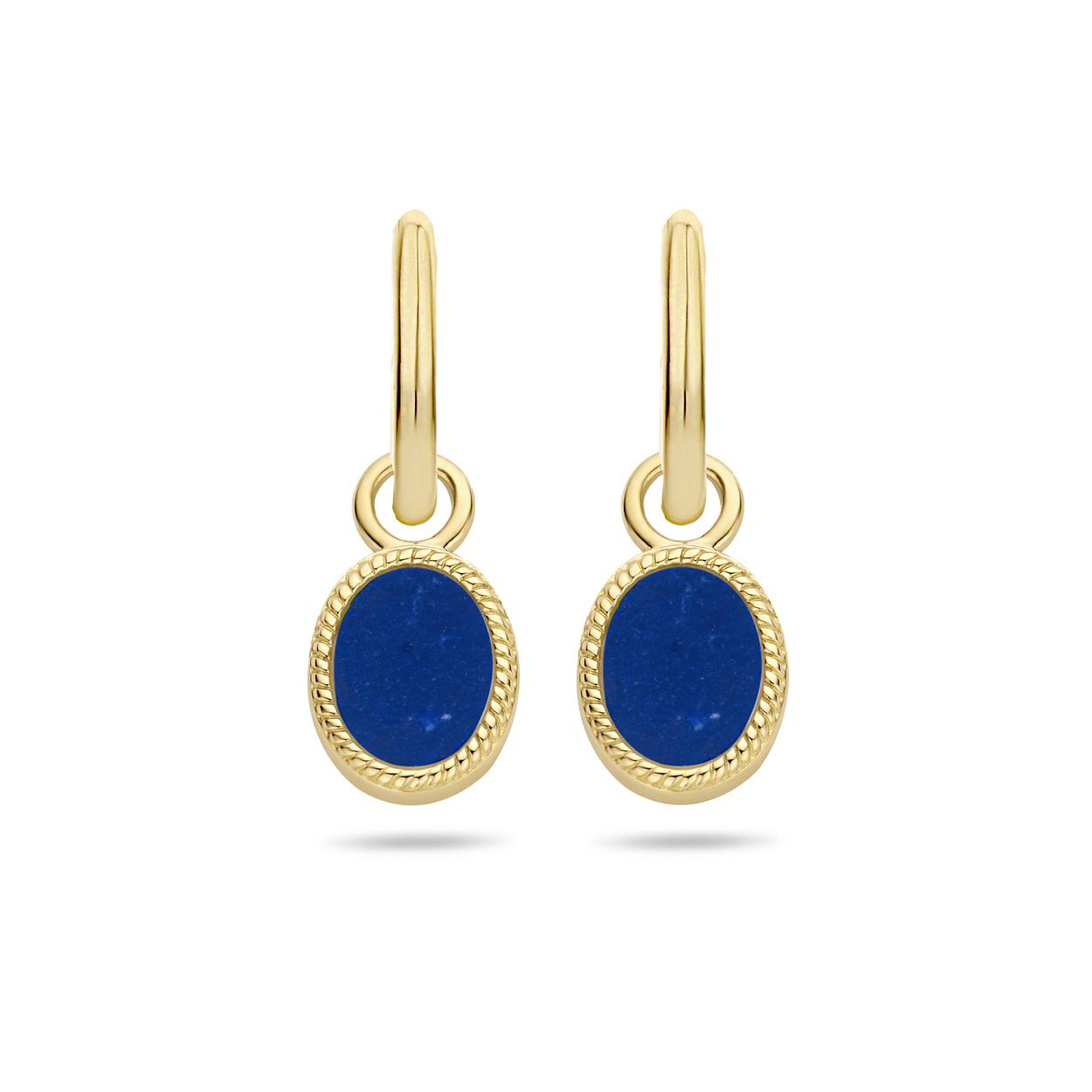 Een ovale blauwe Lapis steen vormt de basis van deze Blush oorbedels 9078YLA. De ovale steen wordt omringd door een geelgoud touwmotief. De bedels zijn uitgevoerd in 14 karaats geelgoud. Ze passen bij iedere outfit en maken jouw eigen oorbellen nog persoonlijker. De plaatjes hebben een diameter van ? millimeter. Deze eyecathers zijn geschikt voor creolen met een buis dikte tot 1,8 millimeter {7232YGO en combineren goed met de ring {1214YLA}. Een goed gekozen Blush juweel zorgt altijd voor een glimlach en het heerlijke gevoel geliefd te zijn. From the heart and made to last, het perfecte cadeau. Blush Jewels worden geleverd in een Blush cadeauverpakking.
