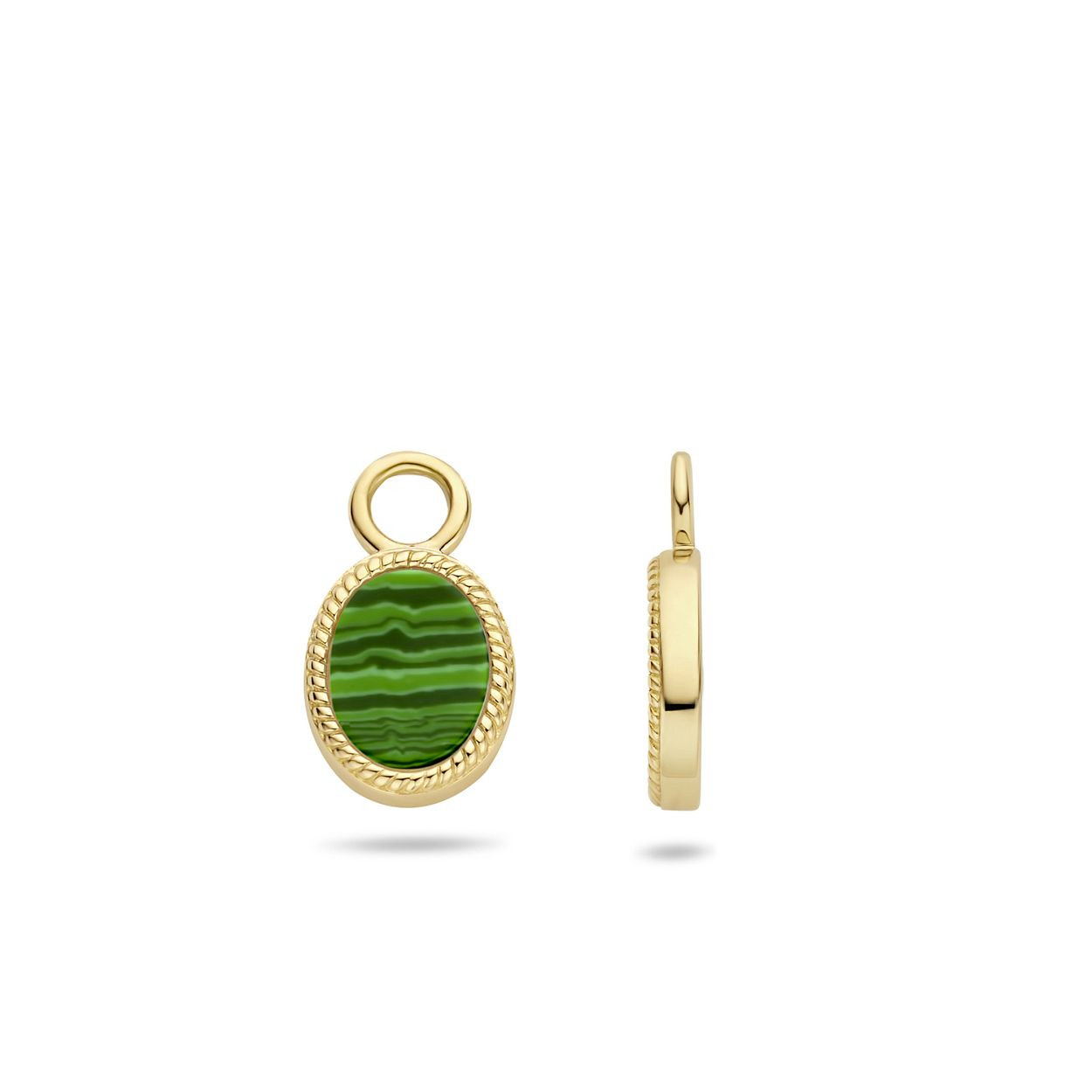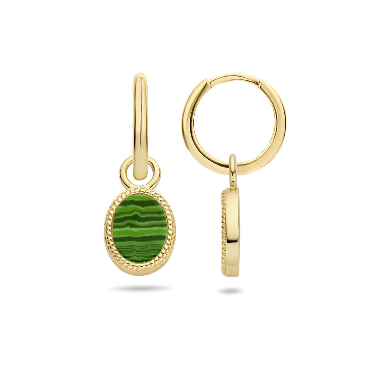 Een ovale groene Malachite steen vormt de basis van deze Blush oorbedels 9078YMA. De ovale steen wordt omringd door een geelgoud touwmotief. De bedels zijn uitgevoerd in 14 karaats geelgoud. Ze passen bij iedere outfit en maken jouw eigen oorbellen nog persoonlijker. De plaatjes hebben een diameter van ? millimeter. Deze eyecathers zijn geschikt voor creolen met een buis dikte tot 1,8 millimeter {7232YGO en combineren goed met de ring {1214YMA}. Een goed gekozen Blush juweel zorgt altijd voor een glimlach en het heerlijke gevoel geliefd te zijn. From the heart and made to last, het perfecte cadeau. Blush Jewels worden geleverd in een Blush cadeauverpakking.