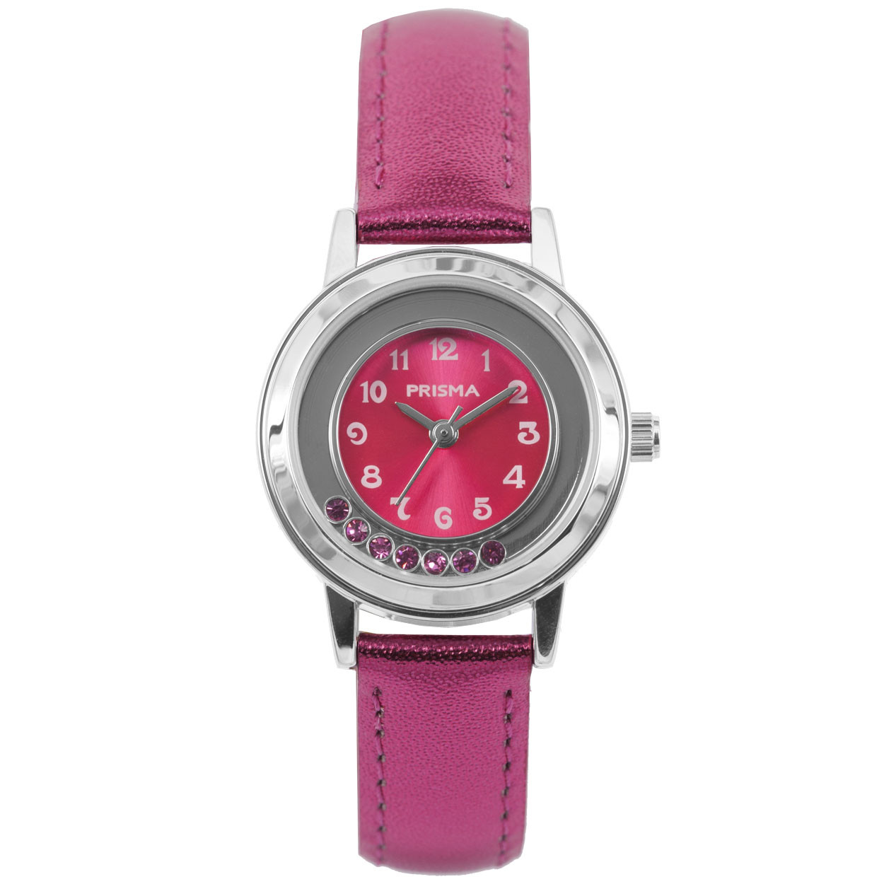 - Wijzerplaat: roze met witte cijfers (arabisch)