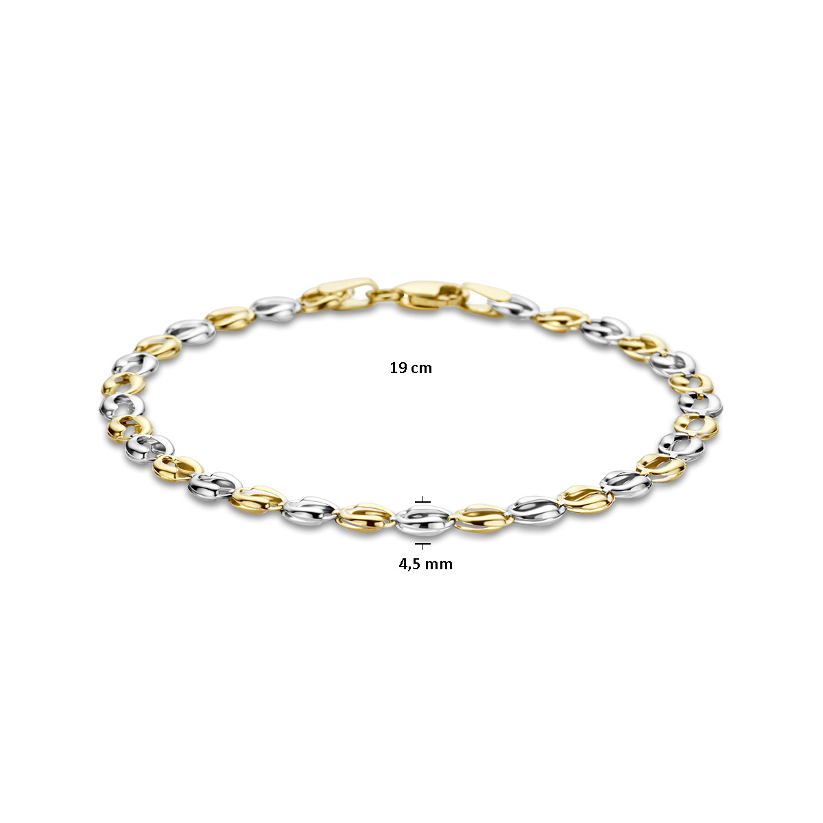 Bicolor geel- en witgouden armband met een schakelbreedte van 4.5mm en een draaglengte van 19cm. De armband is uitgevoerd met karabijn sluiting.