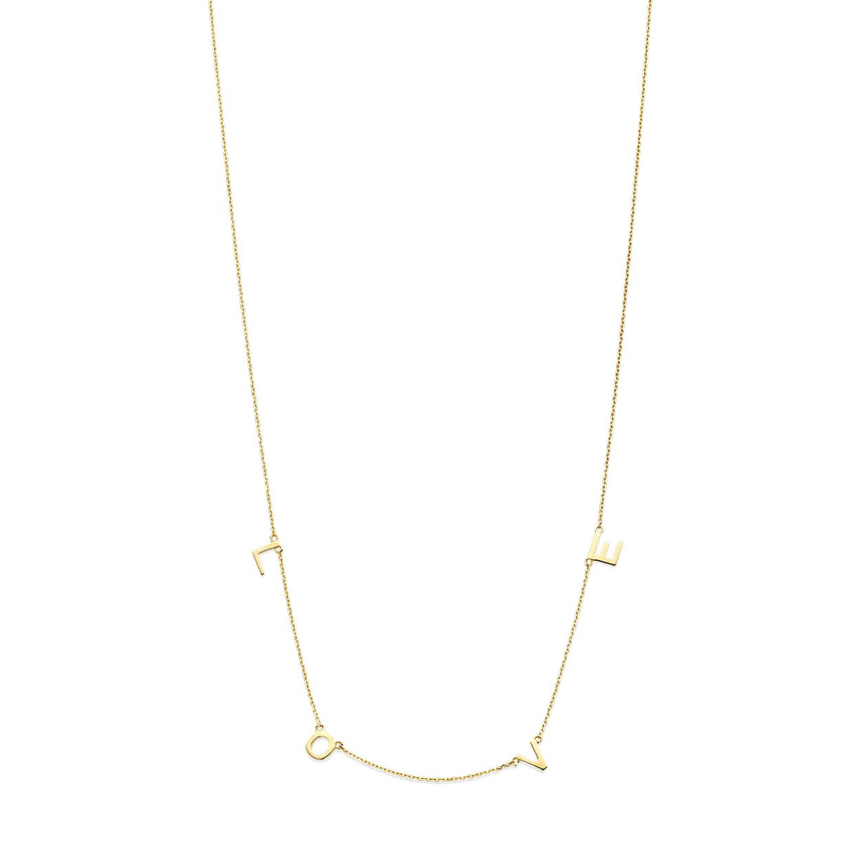 14k Geelgouden collier uitgevoerd met de letters LOVE. De draaglengtes zijn 38, 40 en 42 cm. Uitgevoerd met veerring.