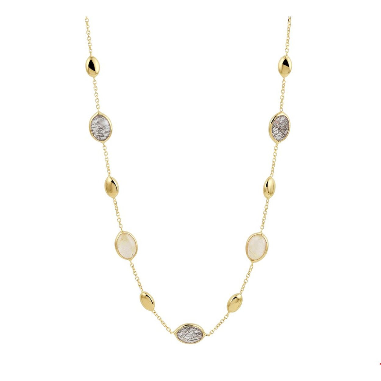 Beschrijving: Dit collier met 7mm edelstenen en 14k geelgouden plaatjes is een musthave in deze tijd! Door de subtiele kleuren van het rutiel kwarts (goud en zwart) is hij te dragen bij heel veel kleding. Het collier heeft een verstelbare lengte van 42 of 45 cm en een karabijn slot. Hij valt door deze lengte mooi rond de hals. De fijne ankerschakel is gemaakt van 14k geelgoud en is 1,1mm breed.