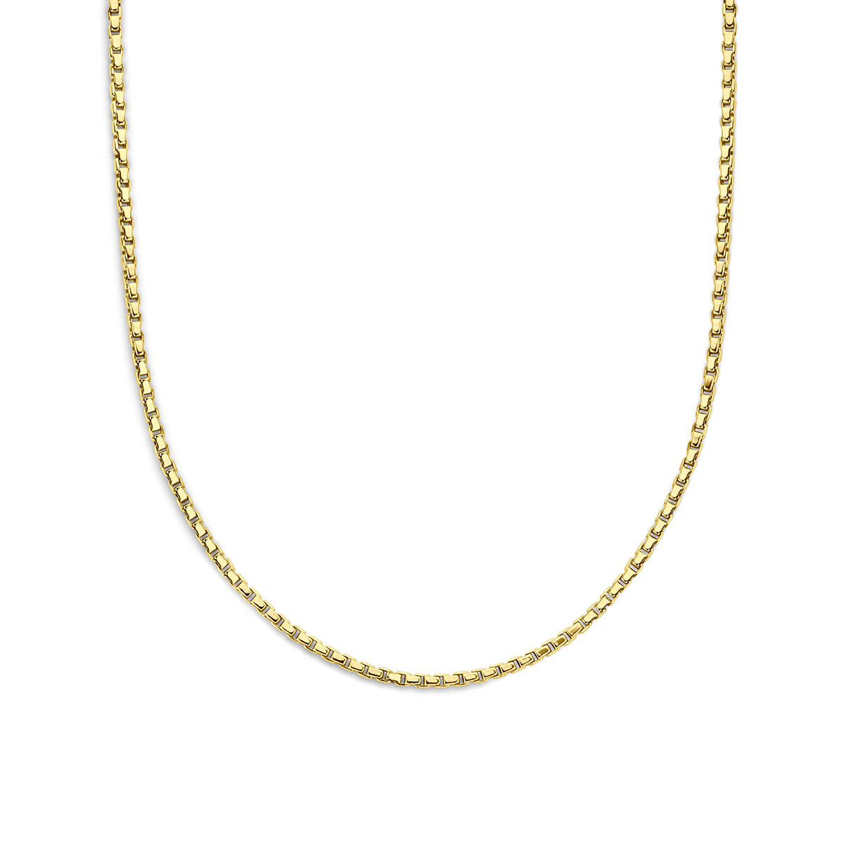 Dit verfijnde gouden Venetiaanse collier straalt tijdloze elegantie uit. Het Venetiaanse ontwerp kenmerkt zich door de fijne, vierkante schakels die strak in elkaar aansluiten, waardoor het collier een glanzende en luxueuze uitstraling krijgt.