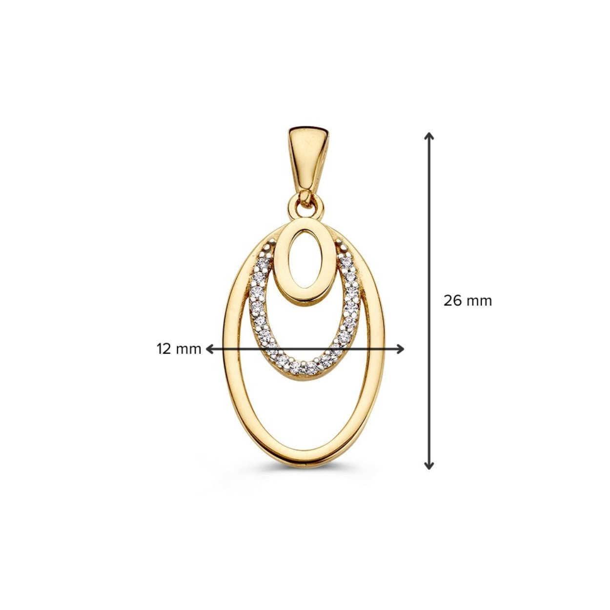 Geelgouden hanger met drie ovalen, waarvan één gezet met zirkonia.
