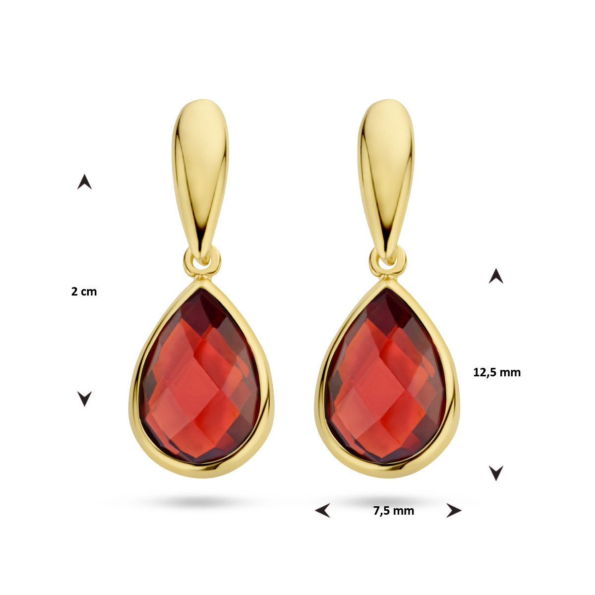 14k Geelgouden oorhangers uitgevoerd met een schitterende granaat. De oorhangers hebben een totale hoogte van 2cm. De granaat stenen hebben een totaal steengewicht van 4.40ct (2x 2.20ct).
