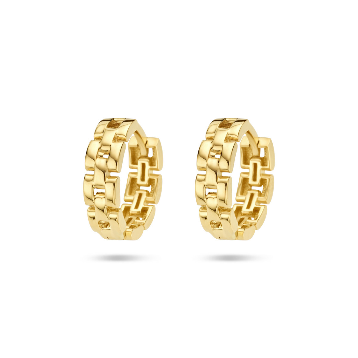 14k Geelgouden klapoorringen met een schakelmotief. De oorringen hebben een diameter van 13mm en zijn voorzien van een scharniersluiting