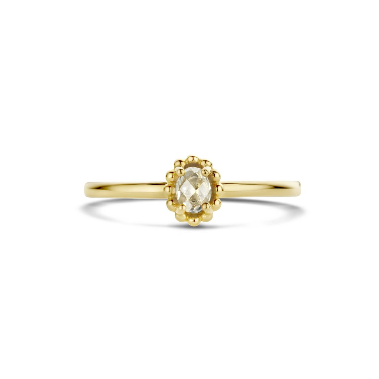 Classic elegance. Deze 14 karaat geelgouden Blush ring { 1227YWT } is uitgevoerd in glanzend gepolijst geelgoud en voorzien van een briljant geslepen witte topaas edelsteen met een van 5,3mm bij 6,5mm. Solitair gedragen zorgt de ring voor een elegant-vrouwelijke uitstraling. Voor een vrouwelijk-geraffineerd effect draag je deze 1,3 millimeter brede ring gecombineerd met meerdere Blush ringen, als aanschuifring.