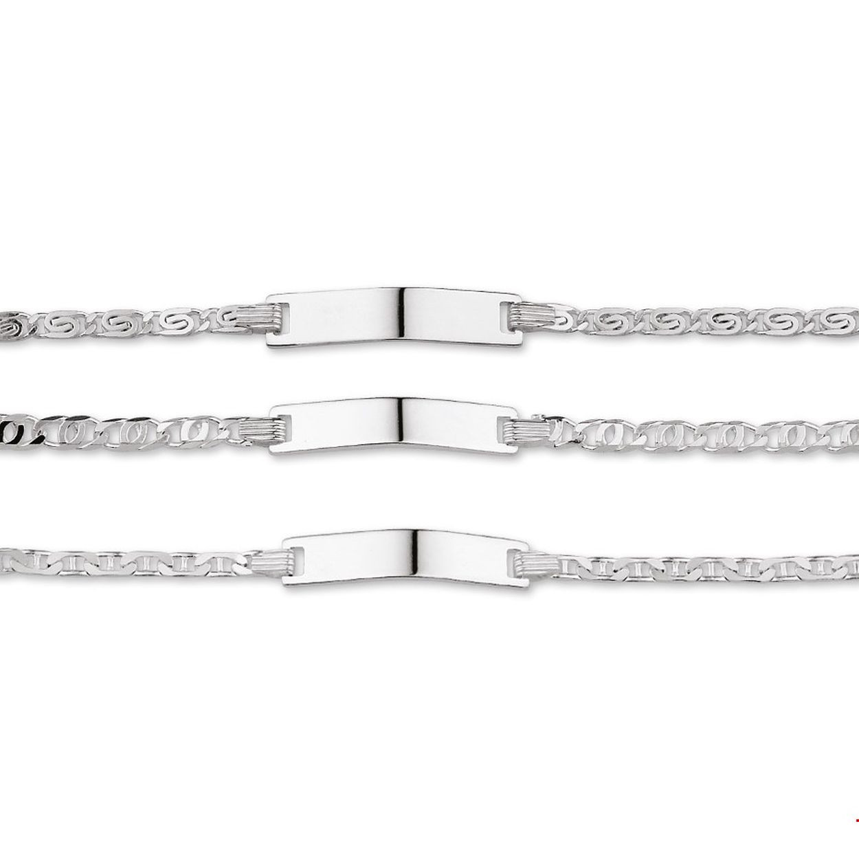 Beschrijving: Assortiment van zilveren graveerarmbanden. De lengte bedraagt 9cm met 2cm extensie. De breedte van de graveerplaat bedraagt 4.2mm.
