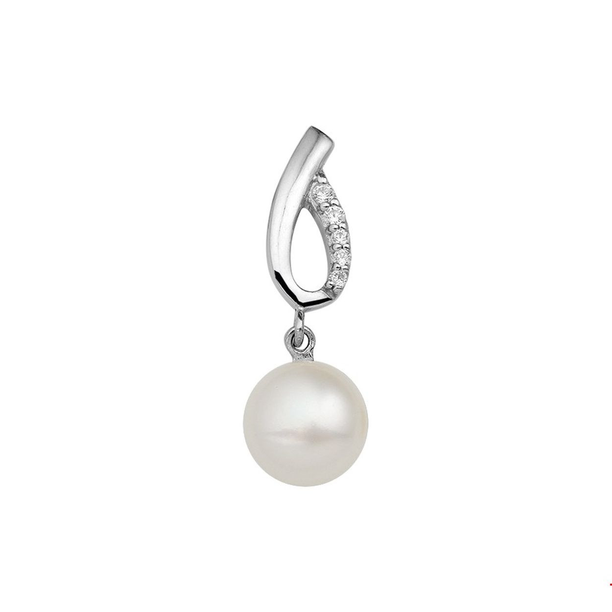 Beschrijving: Gerhodineerd zilveren hanger met zoetwaterparel en zirkonia. De hanger heeft een los hangoog.