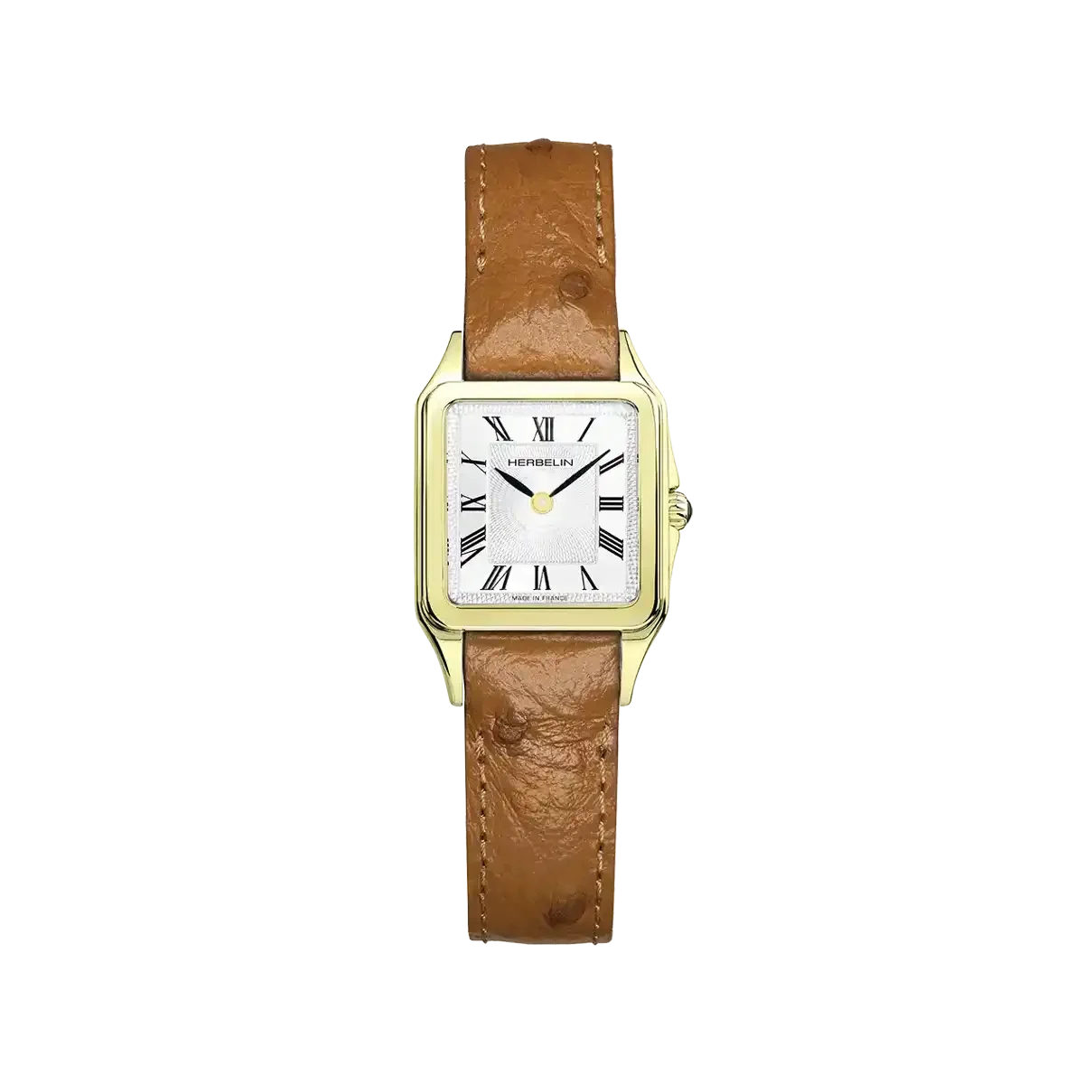 Ontdek de eeuwige charme van het LUNA Gold & Leather-model, gemaakt voor vrouwen die verfijning en singulariteit willen combineren. Dit horloge heeft twee elegante zwarte bladwijzers, die contrasteren met de fijn geguillocheerde zilverwitte wijzerplaat. Dit laatste wordt versterkt door zwarte Romeinse cijferindexen, die een optimale leesbaarheid van de tijd en esthetisch contrast garanderen. Samengesteld uit een vierkante geelgouden PVD roestvrijstalen kast en een echte leren band in struisvogelstijl, in een karameltint, is dit een ware belichaming van luxe en onderscheid. Het voegt een vleugje opmerkelijke originaliteit toe aan het geheel. Aangedreven door een Ronda quartz uurwerk, synoniem voor precisie, wordt dit horloge beschermd door een resistent saffierglas en heeft het een gegarandeerde waterdichtheid tot 50 m om alle vrouwen te begeleiden in hun spannende dagelijkse leven. LUNA Gold & Leather tilt het horloge verder dan zijn oorspronkelijke functie en wordt een kostbaar modeaccessoire, bedoeld om elke voorbijgaande minuut te verfraaien. Dit Made in France-stuk, met een garantie van 2 jaar, illustreert ons meesterschap in de kunst van het prestigieuze horlogeontwerp en bevestigt ons streven naar uitmuntendheid en verfijnde uurwerken.