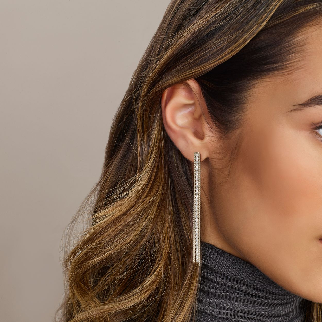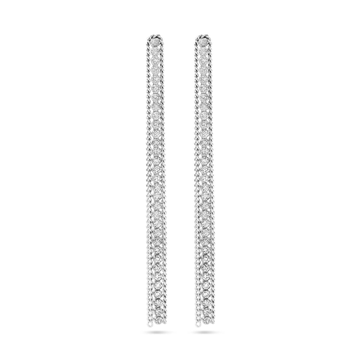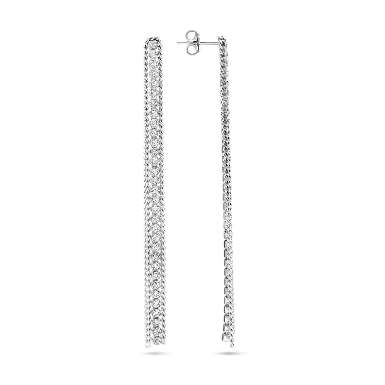 Gerhodineerd 925 zilveren oorhangers uitgevoerd met zirkonia. De oorhangers hebben een totale hoogte van 76mm.