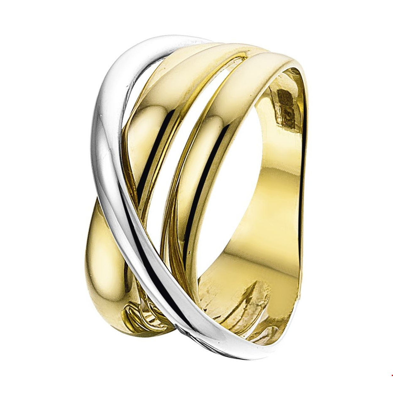 Beschrijving: Bicolor wit- en geelgouden ring.Uniekenummer serie: 35729Verpakt per: 1Doelgroep: damesRingmaat: 17.75 mm (56)Breedte: 11 mm
