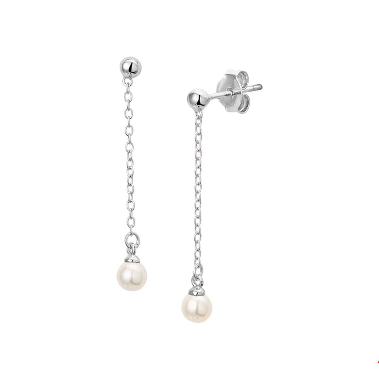Gerhodineerd zilveren oorhangers uitgevoerd met een 4mm imitatie parel verbonden met een anker schakel. De oorhangers hebben een hoogte van 3.2cm.
