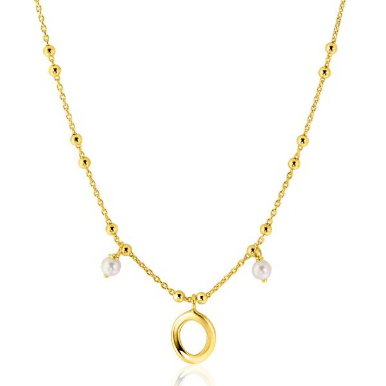 ZINZI gold plated zilveren fantasie ketting met kleine bolletjes, twee bungelende witte pareltjes en organische open vorm in het midden 42-45cm ZIC2405