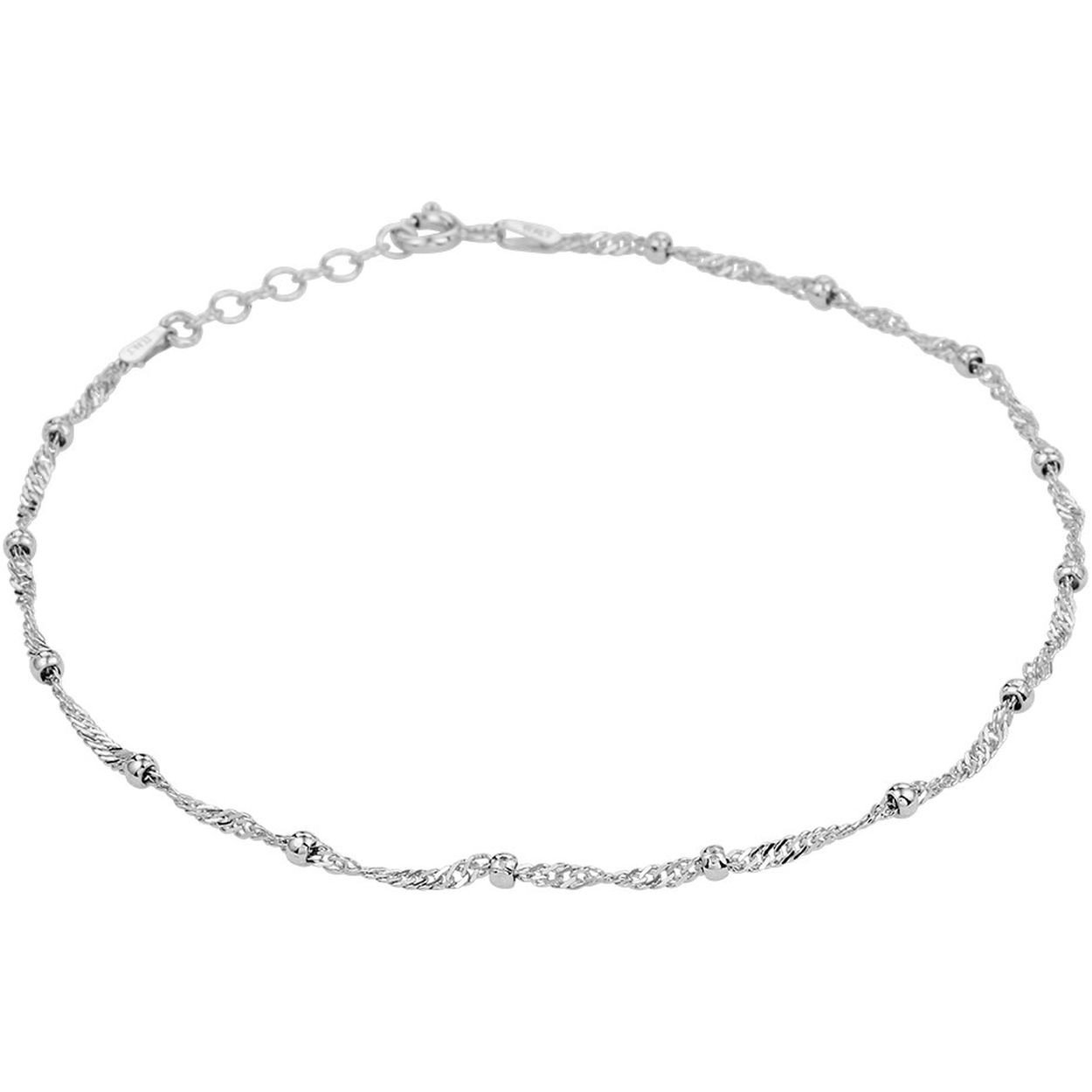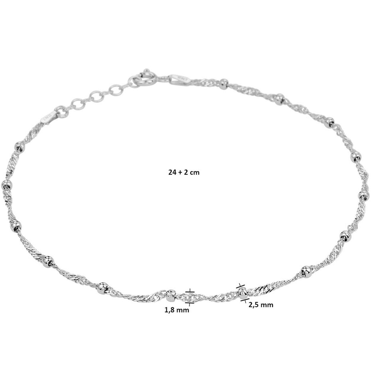 Gerhodineerd 925 zilveren singapore enkelbandje uitgevoerd met bolletjes met een breedte van 2.5mm. Het enkelbandje heeft een draaglengte van 24cm met een extensie van 2cm.