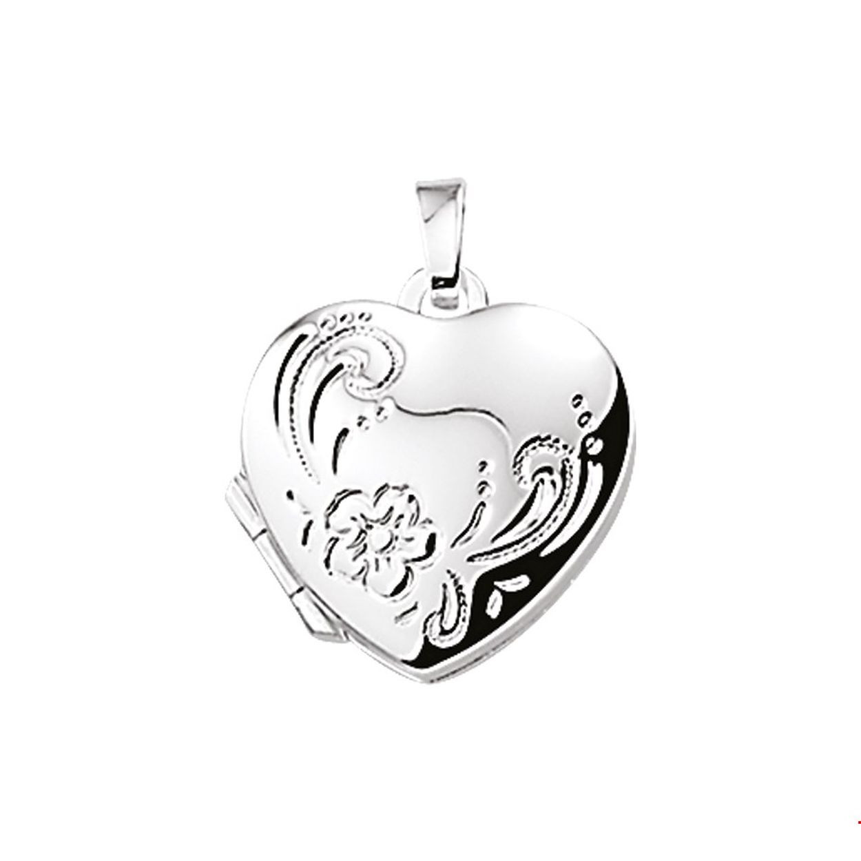 Zilveren hart medaillon met bloemen gravure. In het medaillon passen twee fotos. Doelgroep: DamesMetaalsoort: ZilverBewerking: GravureVoorstelling: HartBreedte: 17,5mmHoogte: 17mm