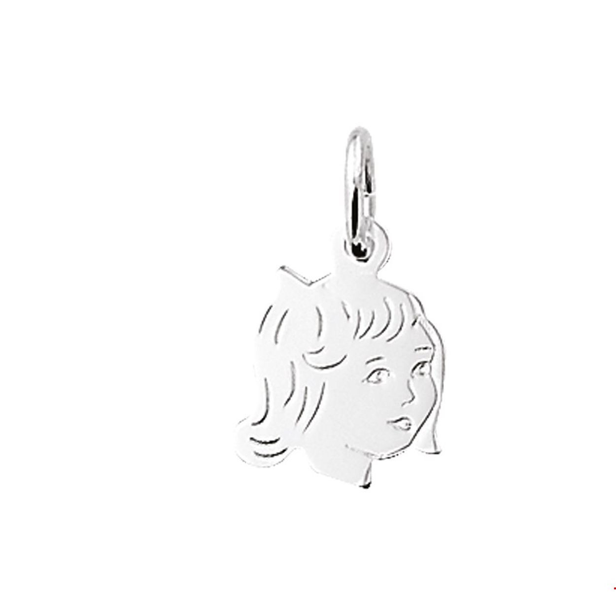 Zilveren geboortehangertje in de vorm van een meisjeshoofdje. Het kinderkopje is gedetailleerd afgewerkt met een mond, ogen en neus. De hanger kan aan de achterzijde worden voorzien van een gravure. De hanger heeft een breedte van 10 millimeter een hoogte van 14 millimeter.