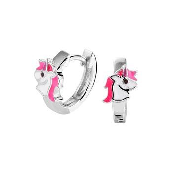 Schattige gerhodineerd zilveren oorringen met scharnier uitgevoerd met een eenhoorn in verschillende kleuren emaille. De oorringen hebben een diameter van 12.5mm.