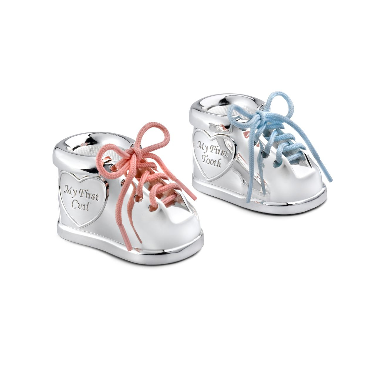 Deze set bestaat uit een tandendoosje en een haarlokdoosje. Ze hebben de vorm van schoentjes en hebben roze en blauwe veters. De formaten van dit product zijn 6x3,5x3,7 cm.
