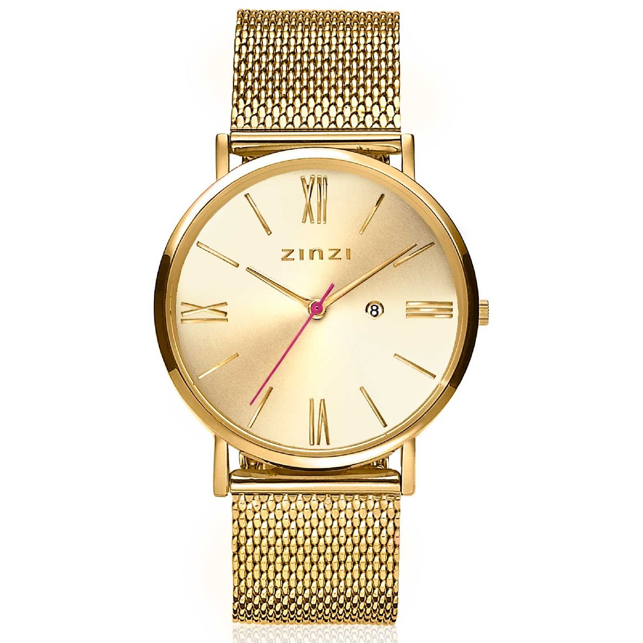 ZINZI Roman horloge goudkleurige wijzerplaat stalen kast geelgoudkleurig stalen mesh band geelgoudkleurig 34mm extra dun ZIW510M